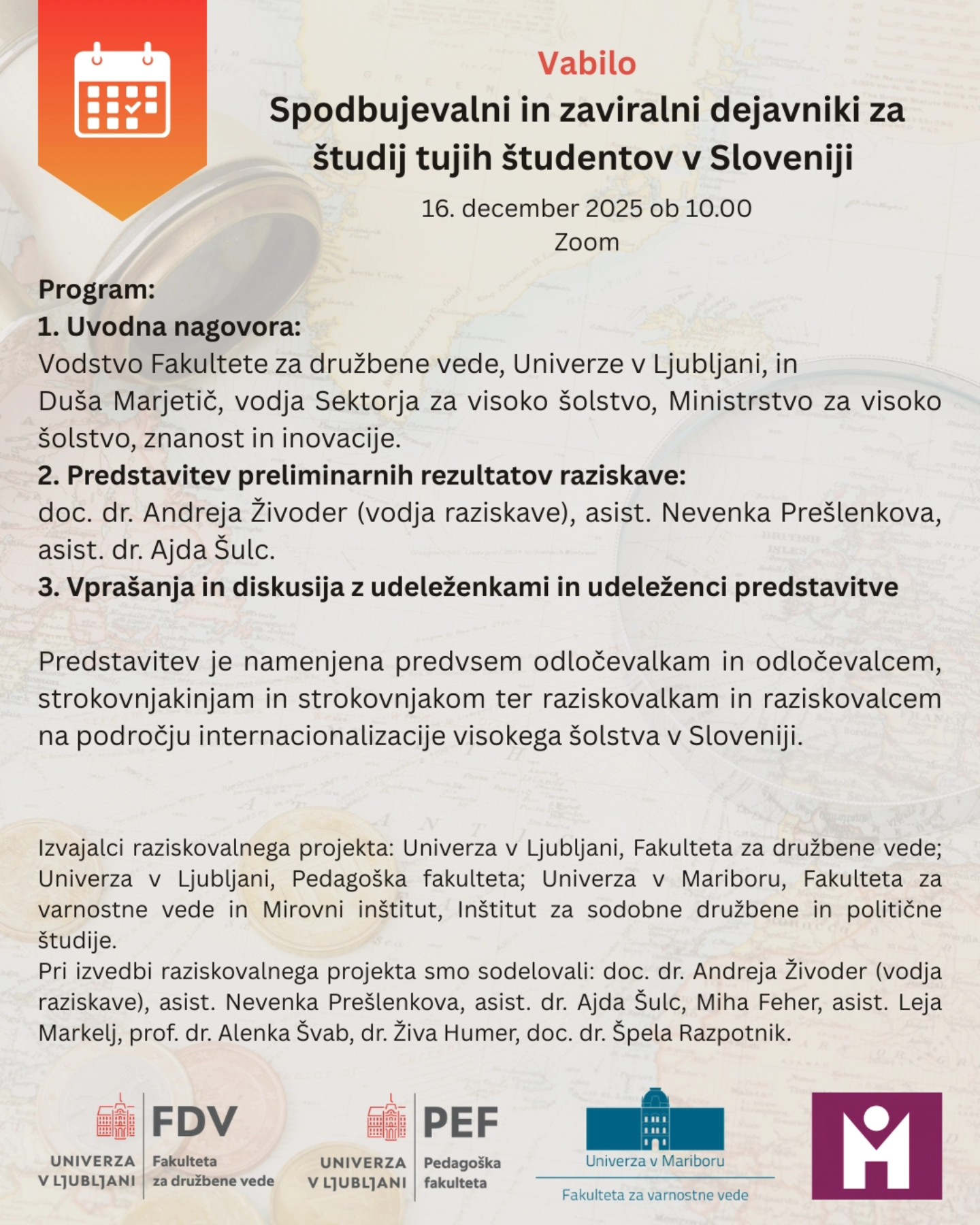 Vabljene_i na spletno predstavitev podatkov, pridobljenih v okviru ciljnega raziskovalnega projekta »Spodbujevalni in zaviralni dejavniki za študij tujih študentov v Sloveniji«.