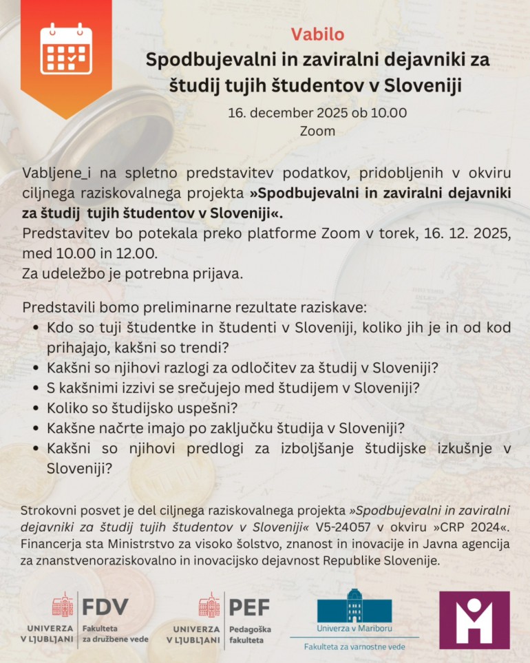 Vabljene_i na spletno predstavitev podatkov, pridobljenih v okviru ciljnega raziskovalnega projekta »Spodbujevalni in zaviralni dejavniki za študij tujih študentov v Sloveniji«.