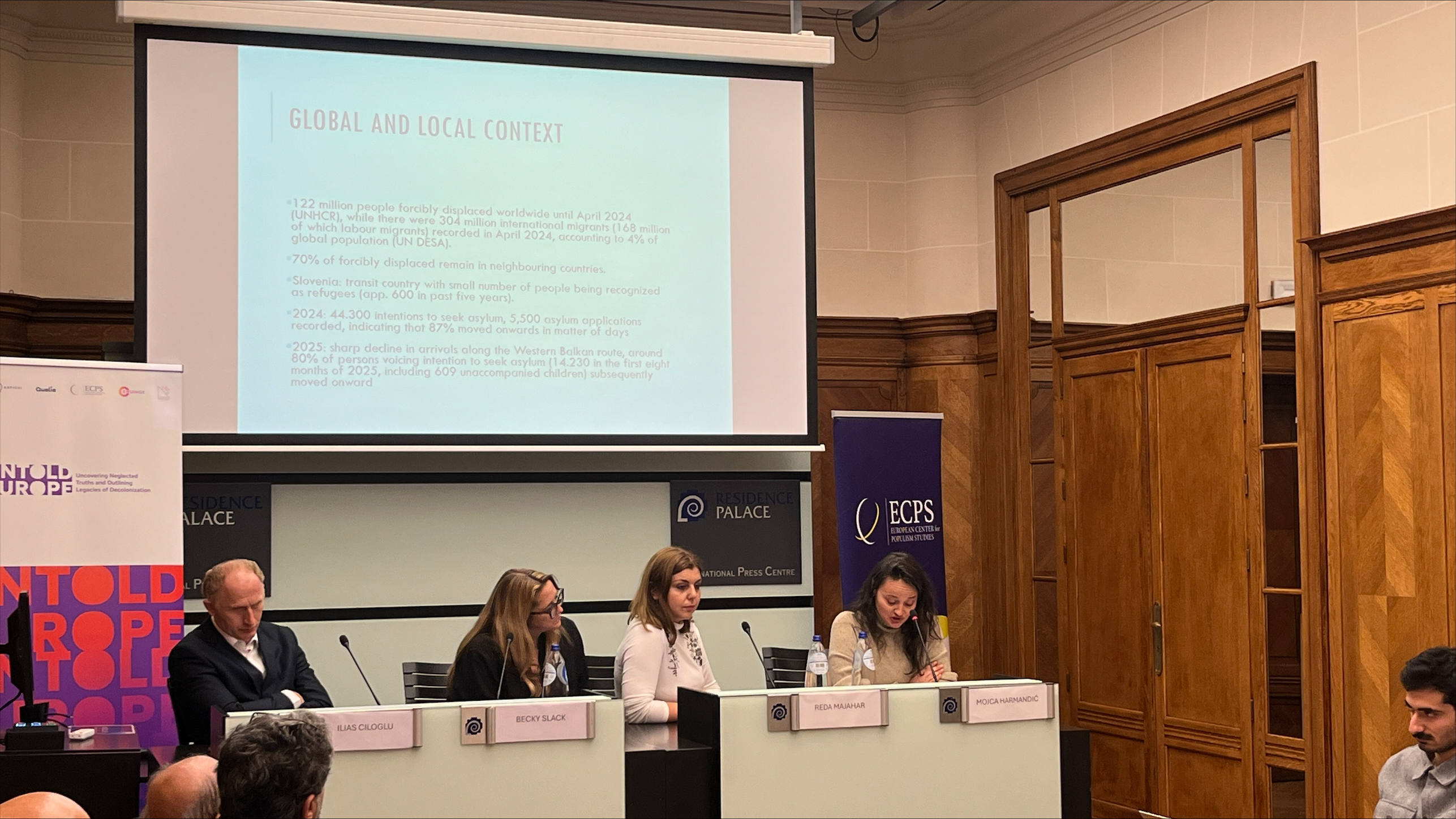 Kolonialne zapuščine niso le del preteklosti – njihovi vplivi še vedno oblikujejo evropske migracijske politike. O teh vplivih so razpravljali na mednarodni delavnici, ki jo je v okviru projekta UNTOLD Europe, dne 21.10.2025 v Bruslju organiziral Evropski center za populistične študije (European Centre for Populism Studies). V okviru razprave o migracijskih izkušnjah, pogledih in pričevanjih sta Katerina Kočkovska Šetinc z Mirovnega inštituta in Mojca Harmandić iz Zavoda Pandorina pot predstavili prispevek »Med potovanji in pripadnostjo: preplet migracij, integracije, podpore in sistemskih ovir v Sloveniji.«